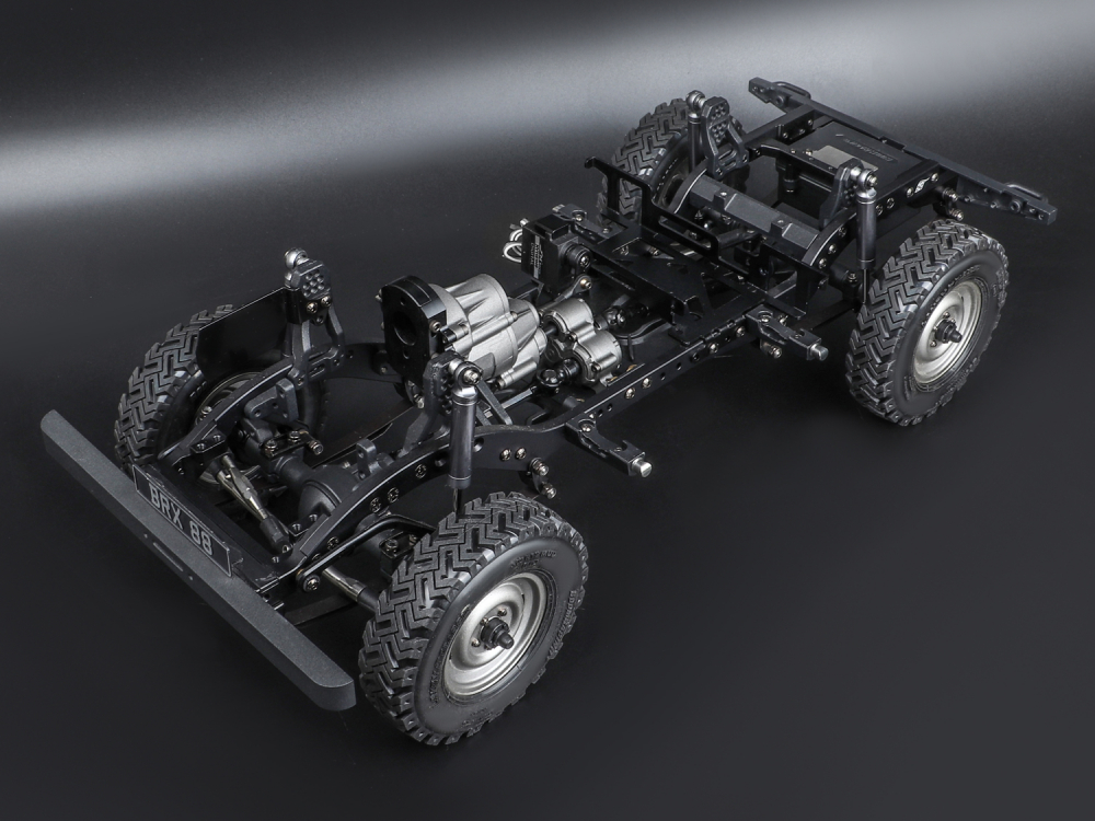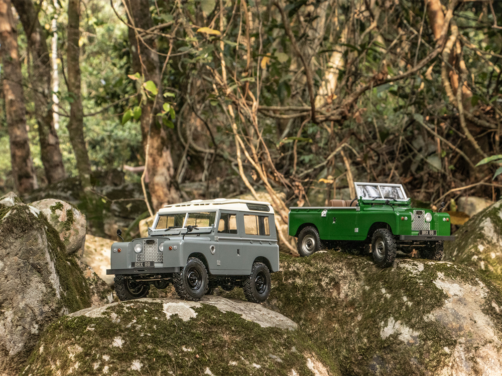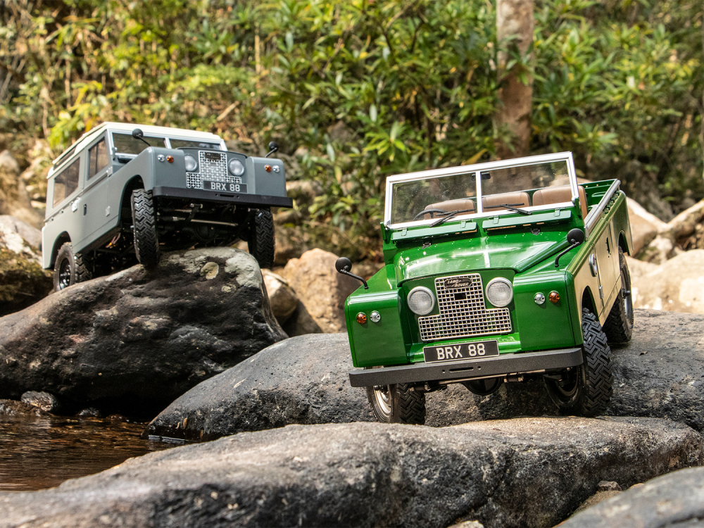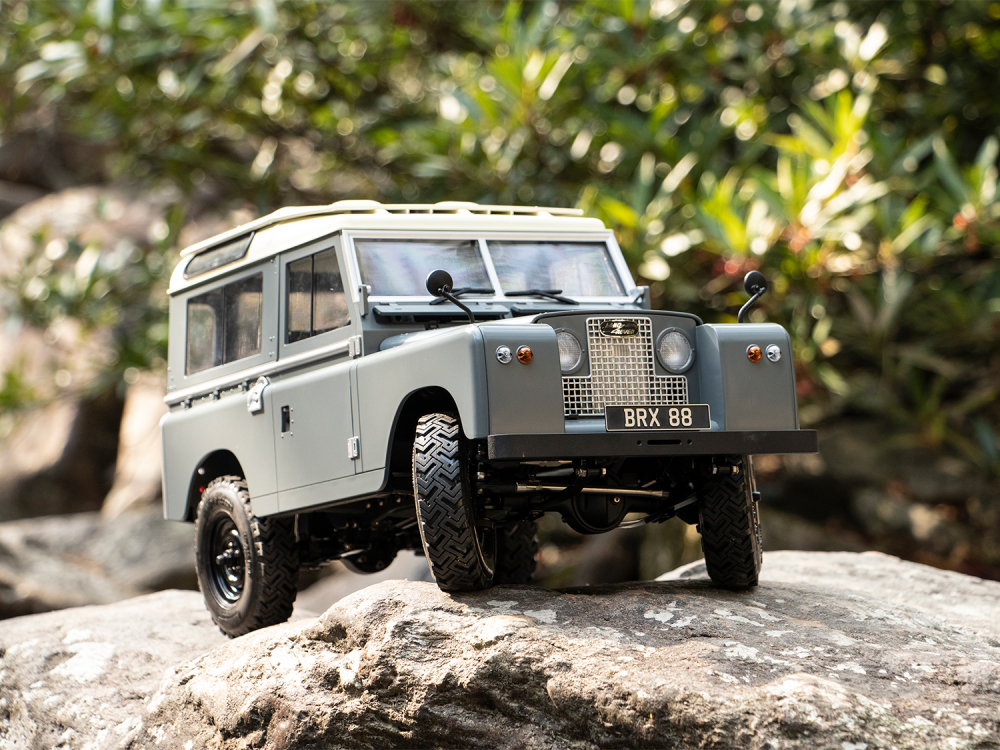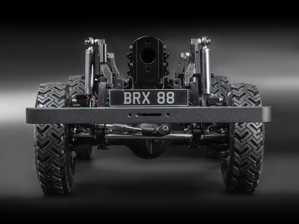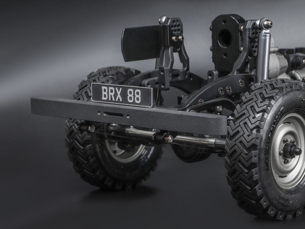PRODUCT INFORMATION: This is the officially licensed Boom Racing BRX02 Land Rover® Series II 88 Station Wagon 1/10 4WD radio control car kit. Commonly referred to as Series Land Rovers, it is arguably one of the world’s most iconic vehicles ever made. Produced from 1958 to 1971, the Land Rover Series II is unshowy, unpretentious, and classless; it is the car that you can arrive with at the Buckingham Palace, a rural farm, or an inner-city estate. The Series Land Rover survived decades largely unchanged, serving farmers and foresters, construction and utility companies, explorers and scientists, armies and airforces – in fact, everyone who needed a good, honest vehicle that would do a good, honest job anywhere in the world. It was a beacon of safety and security too. It was favored by the military, the police, the fire service, NGOs, the UN, the Royal Palace, the Special Forces, and explorers alike. This iconic workhorse discovered new regions, won wars, and saved lives. Regress to a simpler, classier time, and experience the ageless charm of this iconic vehicle. We’ve carefully studied the vehicle extensively and spent over a year designing and producing this scaled-down model kit. After years of waiting for such a model, the Boom Racing Land Rover Series II 88 radio control car kit has finally arrived. What is the BRX02 88? This all-new BRX02 88 is a new class of performance-oriented scale trail truck. It is a short-wheelbase version of the BRX02 109. It shares many similar drivetrain components with the proven BRX01 and BRX02 platforms. It has the same leaf spring suspension setup as the BRX02 109. The BRX02 88, however, has its own identity, with many new parts explicitly designed to work in this smaller chassis. Multiple updates were made to the BRX02 88 to fit the shorter 280mm wheelbase Series II 88 body. These updates include a direct heavy-duty steel driveshaft between the BCF2™ transmission and the B2X™ transfer case for improved drivetrain efficiency and a battery tray ready to be integrated with a full-size servo winch. Front suspension travel has been improved with an updated aluminum chassis rail. Even though it is much smaller than the BRX02 109, don't expect anything less from us. The chassis layout of this BRX02 88 is well thought through from the ground up. We've designed this short-wheelbase chassis to include all of the most desired trail truck features, fitting a two-speed transmission, optional overdrive (by swapping t-case gears), 2WD/4WD transfer case, or dig transfer case, an optional full-size internal servo winch with routing cable, an optional LED light kit, an optional rock light set, all with a full interior installed. The BRX02 88 includes the narrow BRX80 Scale PHAT™ axles to give the truck the correct scale appearance. It has the B2X™ anti-torque twist aluminum transfer case that is identical to the original BRX02 transfer case but has the additional feature of being overdrive ready. A pair of 6mm aluminum frame rails for superior strength, chassis rigidity and predictable handling. A stainless steel ESC mounting plate next to the front motor replaces the carbon fiber at the rear end of the chassis of the BRX02. To re-create the original Series II appearance, the body sits slightly lower with 80mm KUDU™ scale shock dampers, and the front and rear bumpers were changed to the Series II design. The front bumper includes space for a fairlead, and the rear bumper includes left and right-side crossmember grab handles. The front and rear skid plate sliders are designed with maximum ground clearance in mind and molded in nylon for added strength and to keep the CG lower. One of the main challenges in designing this scaled-down Series II was to keep the wheels tucked inside the body at all times while having good steering ability with a full leaf spring setup. This was achieved by using the BRX80 Scale PHAT™ axles, plus an all-new XT502PIN pin wheel hub that is narrower than the XT500 pin hub. The other challenge was to figure out a way to relocate the steering servo. Series IIs had quite a significant recessed grill which interfered with the way the BRX02 Leaf chassis is set up. We designed a new servo mount and moved the servo under the motor, and by flipping the BCF2™ transmission motor mount upside down we created enough space for the servo and added a good amount of suspension travel. The chassis is fitted with our new SLR™ 1.9” steelie beadlock wheels that come with scale wheel caps with a tool included for easy installation, as well as new scale screws that were specifically designed for these wheels, with a tool included. The wheels are paired with a set of Landy Classic™ 1.9” scale tires in Gekko™ Black (super soft) compound. This soft and tacky rubber is our proprietary compound which is used in many of our tires and is formulated for crawler performance and durability in rough terrains. The original BRX02 concept The BRX02 is our top-of-the-line scale performance off-road chassis. It is the result of continuous development and improvement of the highly-rated BRX01, developed in close collaboration with many scale hobbyists around the world. You can expect to build an ultra-realistic R/C model vehicle that gives you great performance straight out of the box. It shares the same drivetrain with the BRX01 – a top-quality robust driving system that has made a name for itself in the industry for being durable and efficient. At its core is the small footprint BCF2™ transmission with 2-speed, hi-lo remote shifting ability. The transfer case sits on a high-clearance skid plate that lifts the belly up for fewer overhangs. The BADASS™ heavy-duty front and rear steel axle shafts and KUDU™ center CVD driveshafts are durable, smooth, and capable of high articulation angles. KUDU™ driveshafts are rebuildable and have become the standard for all future Boom Racing vehicles. The BRX80 Scale PHAT™ axles use our proprietary AR44 h