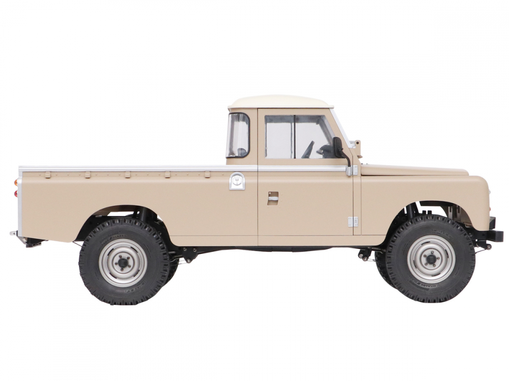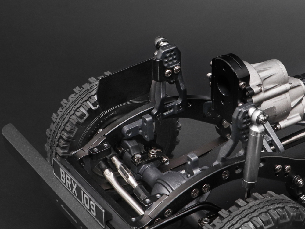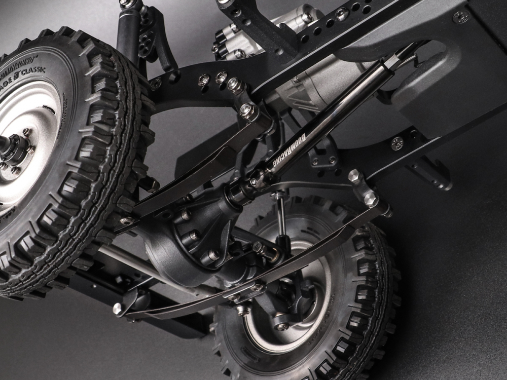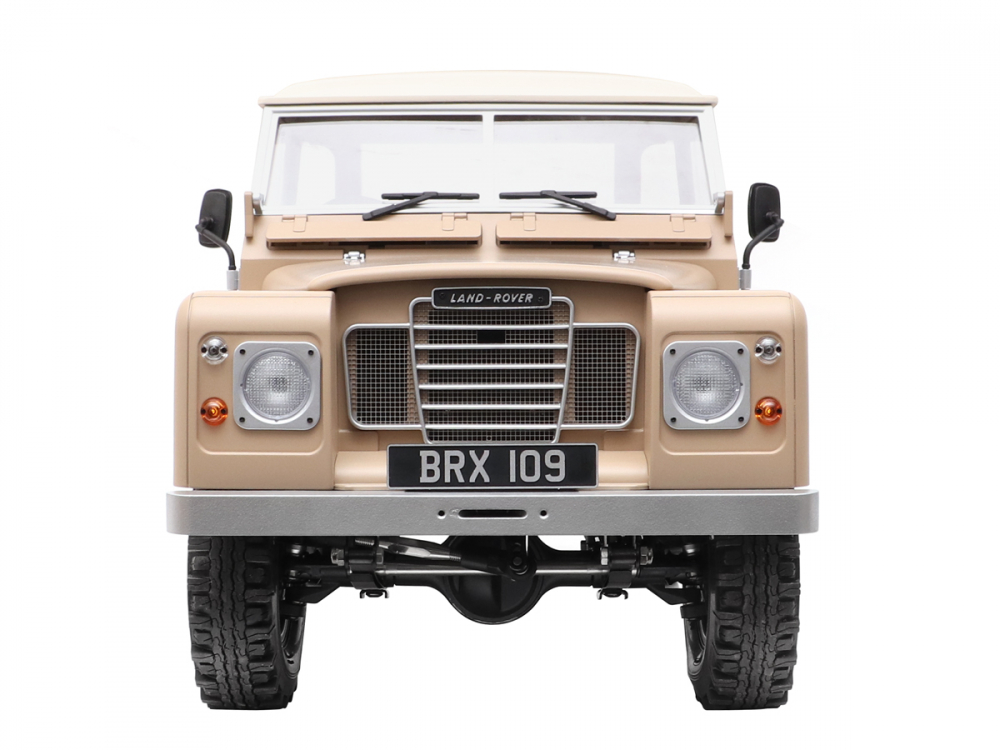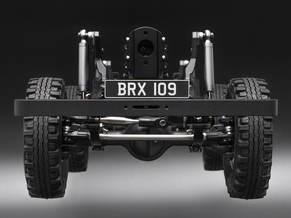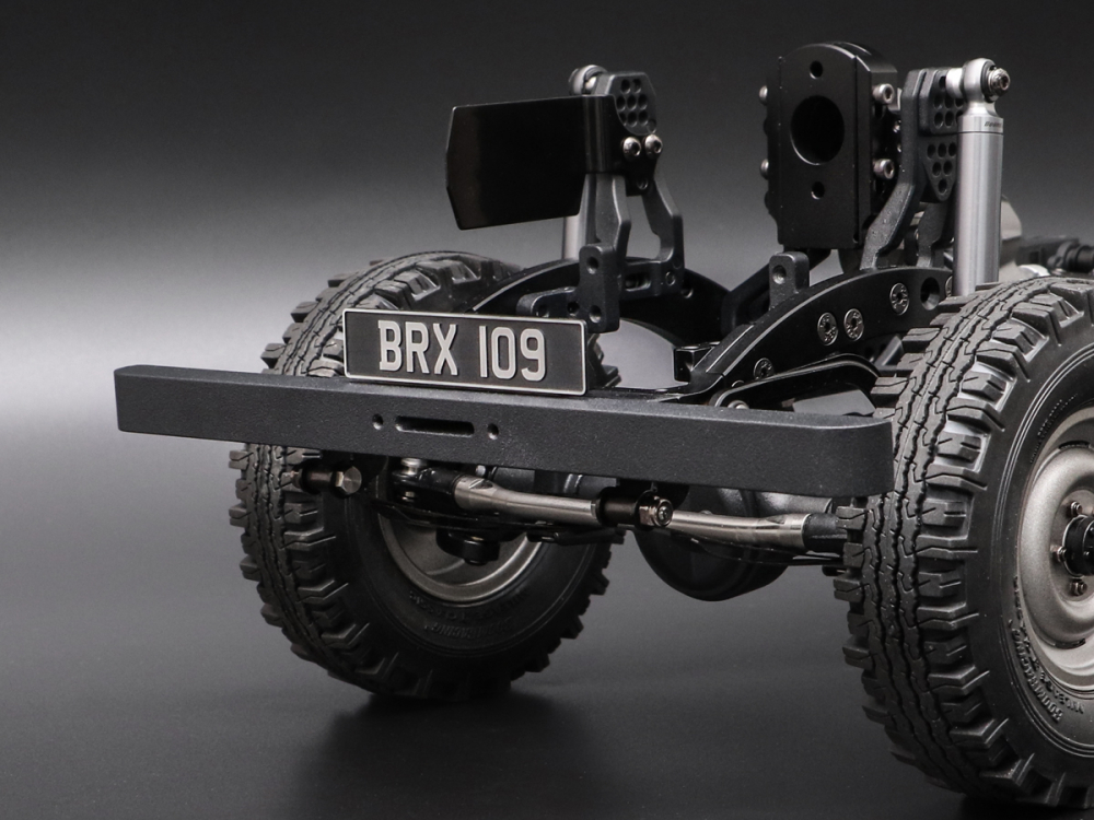 PRODUCT INFORMATION: Watch a video introduction about this product This is the officially licensed Boom Racing BRX02™ Land Rover® Series III 109 Pickup 1/10 4WD radio control car kit. Commonly referred to as Series Land Rovers, it is arguably one of the world’s most iconic vehicles ever made. Produced from 1971 to 1985, the Land Rover Series III is unshowy, unpretentious, and classless; it is the car that you can arrive with at the Buckingham Palace, a rural farm, or an inner-city estate. The Series Land Rover survived decades largely unchanged, serving farmers and foresters, construction and utility companies, explorers and scientists, armies and airforces – in fact, everyone who needed a good, honest vehicle that would do a good, honest job anywhere in the world. It was a beacon of safety and security too. It was favored by the military, the police, the fire service, NGOs, the UN, the Royal Palace, the Special Forces, and explorers alike. This iconic workhorse discovered new regions, won wars, and saved lives. Regress to a simpler, classier time, and experience the ageless charm of this iconic vehicle. We’ve carefully studied the vehicle extensively and spent over a year designing and producing this scaled-down model kit. After years of waiting for such a model, the Boom Racing Land Rover Series III 109 radio control car kit has finally arrived. What is the BRX02 109? The Boom Racing Land Rover Series III project began with the BRX02 Leaf chassis as a starting platform with a 334mm wheelbase. We’ve made multiple changes to retrofit this new classic body. These changes include using the slightly narrower BRX80 Scale PHAT™ axles, a new B2X™ anti-torque twist aluminum transfer case that is identical to the original BRX02 transfer case but has the additional feature of being overdrive ready. New 6mm aluminum frame rails for superior strength, chassis rigidity and predictable handling. A new stainless steel ESC mounting plate next to the front motor replaces the carbon fiber ESC plate at the rear end of the BRX02 Leaf chassis. To re-create the original Series III appearance, the body sits slightly lower with 80mm KUDU™ scale shock dampers, and the front and rear bumpers were changed to the Series III design. The front bumper includes space for a fairlead, and the rear bumper includes left and right-side crossmember grab handles. The front and rear skid plate sliders are designed with maximum ground clearance in mind and molded in nylon for added strength and to keep the CG lower. One of the main challenges in designing this scaled-down Series III was to keep the wheels tucked inside the body at all times while having good steering ability with a full leaf spring setup. This was achieved by using the BRX80 Scale PHAT™ axles, plus an all-new XT502-Pin pin wheel hub that is narrower than the XT500 pin hub. The other challenge was to figure out a way to relocate the steering servo. Series IIIs had quite a significant recessed grill which interfered with the way the BRX02 Leaf chassis is set up. We designed a new servo mount and moved the servo under the motor, and by flipping the BCF2™ transmission motor mount upside down we created enough space for the servo and added a good amount of suspension travel. The chassis is fitted with our new SLR™ 1.9” steelie beadlock wheels that come with scale wheel caps with a tool included for easy installation, as well as new scale screws that were specifically designed for these wheels, with a tool included. The wheels are paired with a set of Mileage Classic™ 1.9” scale tires in Gekko™ Black (super soft) compound. This soft and tacky rubber is our proprietary compound which is used in many of our tires and is formulated for crawler performance and durability in rough terrains. With all the above updates, we’ve given the chassis its own new identity – the BRX02 109. The original BRX02 concept The BRX02 is our top-of-the-line scale performance off-road chassis. It is the result of continuous development and improvement of the highly-rated BRX01, developed in close collaboration with many scale hobbyists around the world. You can expect to build an ultra-realistic R/C model vehicle that gives you great performance straight out of the box. It shares the same drivetrain with the BRX01 – a top-quality robust driving system that has made a name for itself in the industry for being durable and efficient. At its core is the small footprint BCF2™ transmission with 2-speed, hi-lo remote shifting ability. The transfer case sits on a high-clearance skid plate that lifts the belly up for fewer overhangs. The BADASS™ heavy-duty front and rear steel axle shafts and KUDU™ center CVD driveshafts are durable, smooth, and capable of high articulation angles. KUDU™ driveshafts are rebuildable and have become the standard for all future Boom Racing vehicles. The BRX80 Scale PHAT™ axles use our proprietary AR44 heavy-duty steel triangular keyed bevel helical cut 30/8T diff gears, with the same but reversed cut gears in the rear axle to cancel out almost all of the torque twist from the drivetrain. The leaf spring suspension with KUDU™ 80mm scale shocks gives a realistic ride height to the Series III. Optimized for scale performance, it features a billet aluminum cylinder body for durability, steel shock shaft with titanium nitride coating, plastic pivot retainers (replaceable) for smoother swivel movements, high degree pivot angle for high-angle articulation, double X-Ring oil seals, and comes with cylinder and friction seals to prevent leaks and contaminants from entering. The bump stop provides an additional level of bottoming control, stainless steel pivot balls for stainless, corrosion-resisting pivot rotation, and an aluminum pivot ball tool included for hassle-free maintenance. The leaf spring unit has a master leaf with three graduated leaves for suspension stability and adjustability. You may use up to four leaves for adjus